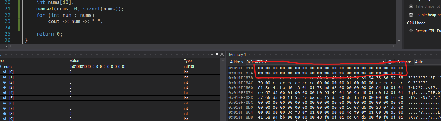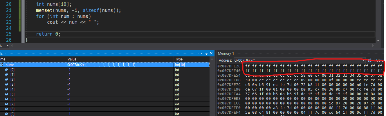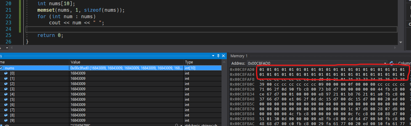 즉, 위와 같은 코드는 nums의 주소에서 시작해서 sizeof(nums)바이트 만큼 모든 바이트를 1 초기화하라 라는 명령이다. 그런데 우리가 자주 사용하는 int는 4바이트 정수이지 않은가. 그 결과 우리의 배열 nums의 각 원소들은 16진수로 0x01010101이며 10진수로는 16,843,009인 값으로 초기화된 것이다. 비주얼 스튜디오에서 메모리 맵을 살펴보면 아래의 이미지와 같이 초기화된 것을 확인할 수 있다.