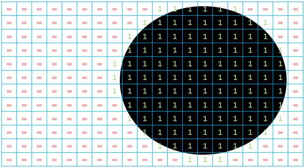 어떤 물체 하나를 Custom Depth Buffer에 등록했고 카메라 앞에 있다고 가정하자. 이 물체가 출력될 픽셀에는 카메라로 부터 거리에 따라 깊이 값을 가질 것이다. 그러나 그 외의 픽셀들은 거의 무한대에 가까운 아주 큰 값을 가질 것이다.(실제로 무한대는 아니지만 편의상 여기서는 무한대로 표현하였다.) 물체가 출력될 픽셀이 어느 정도 값을 가지긴 할 테지만 무한대에 가까운 물체 밖에 비해서는 턱없이 작기 때문에 그냥 1이라고 가정하자. 그러면 Custom Depth Buffer에는 아래와 같이 물체가 출력되지 않을 픽셀에는 거의 무한대에 가까운 값이 들어있을 것이고, 물체가 출력될 픽셀에는 1과 같이 작은 값이 들어 있을 것이다.