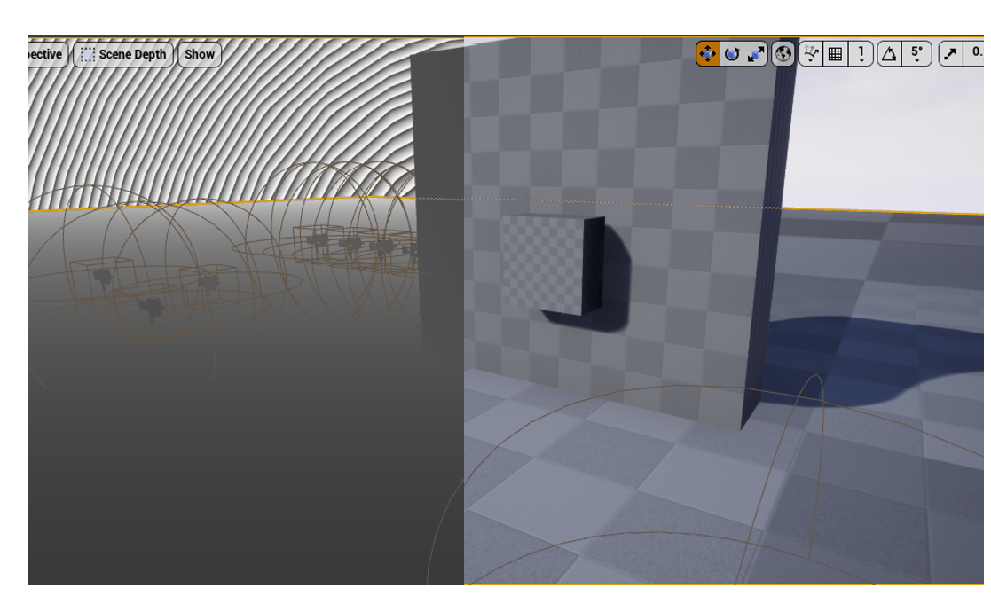 언리얼 엔진은 Post Process Material 기법을 제공한다. Post Process란 1차적으로 장면을 렌더링 한 결과를 텍스처처럼 활용할 수 있도록 하는 기법이다. Post Process Material에서는 Depth Buffer도 활용할 수 있다. Depth Buffer에는 카메라와 가까운 픽셀일수록 낮은 값을 가진다. Depth Buffer를 출력하면 아래와 같이 회색조 결과를 볼 수 있다. (카메라에 가까울수록 낮은 색상값인 검은색을 보인다.)