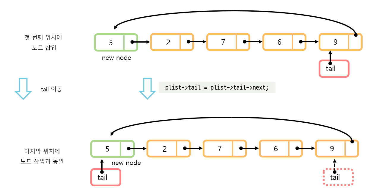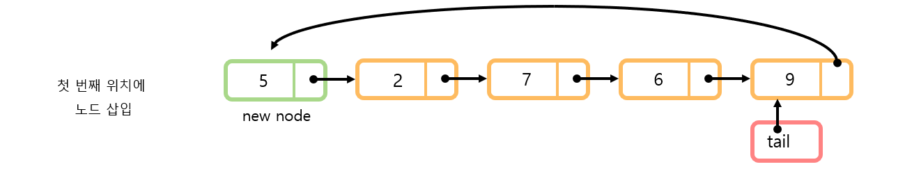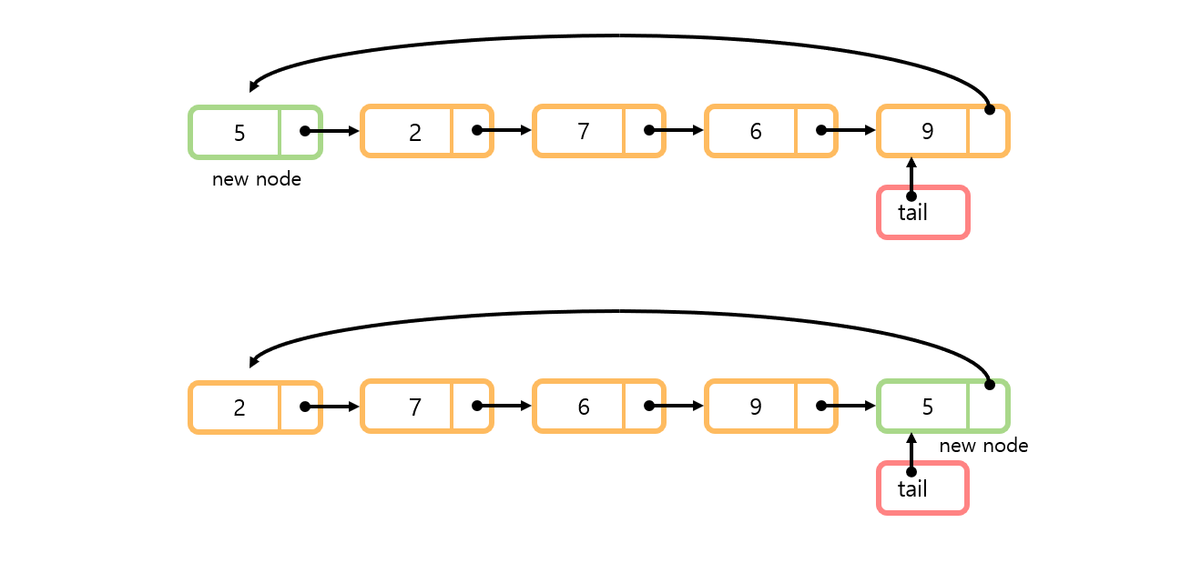 을 사용하면 \(O(1)\)회로 리스트의 첫번째 위치 혹은 마지막 위치에 노드를 삽입 할 수 있다. - 그리고 원형 연결 리스트의 머리부분에 새로운 노드를 삽입하는 것은 직관적으로 간단하다.
