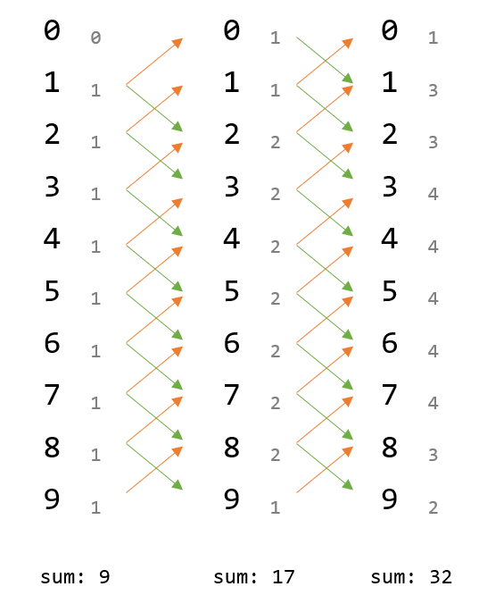 N자리의 계단수가 되기 위해서는 N자리에 숫자는 N-1자리의 숫자와 1만큼 차이가 나야 한다. 각 자릿수마다 끝자리 숫자를 기준으로 만들 수 있는 수의 개수를 카운트할 수 있다. 예를 들어 두 자릿수들 중 3으로 끝나는 계단 수는 23, 43 두 개가 존재하고, 5로 끝나는 계단 수는 45, 65가 존재한다. 그렇다면 세 자리 수중 4로 끝나는 계단수는 몇 개가 존재할까? 두 자리 수중 3으로 끝나는 수들의 개수와 5로 끝나는 수로 세 자릿수 중 4로 끝나는 계단 수를 만들 수 있기 때문에 총 4개를 만들 수 있다.(234, 434, 454, 654) 이를 그림으로 표현하면 아래와 같다.
