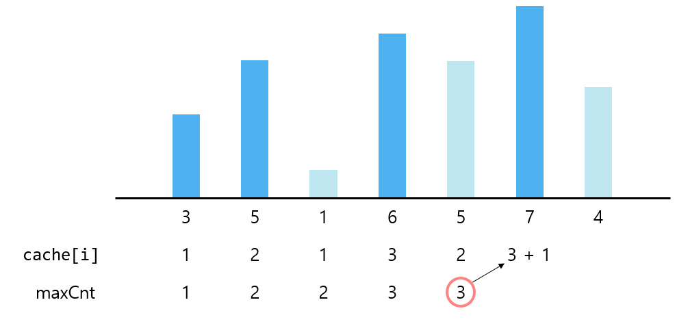 마지막 숫자가 i인 경우의 값이 중복으로 사용됨을 확인할 수 있다. 이 값을 저장해두는 배열을 만들면 중복 계산을 줄일 수 있다. 즉 cache[i]는 마지막 숫자가 i번째 숫자로 끝나는 수열의 길이로 정할 수 있다. 그리고 cache[i]의 값은 cache 배열의 1 ~ i-1 마지막 숫자가 i번째 숫자보다 작은 값인 수들 중 최댓값 + 1이 될 수 있다.