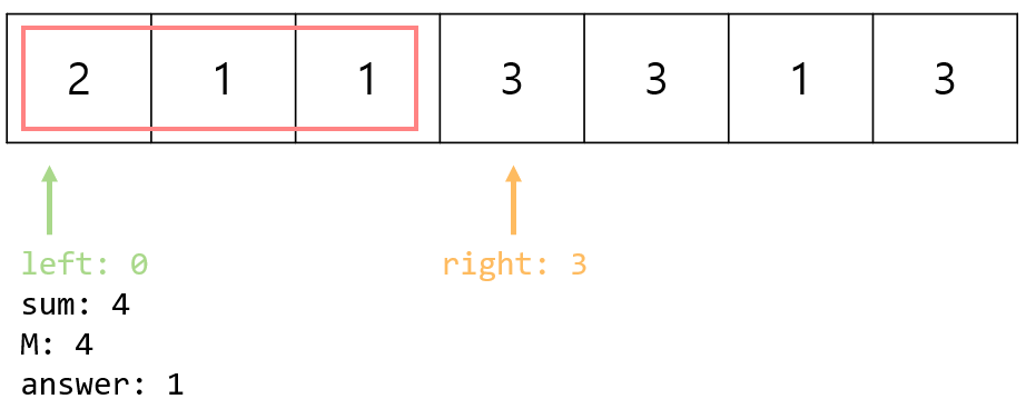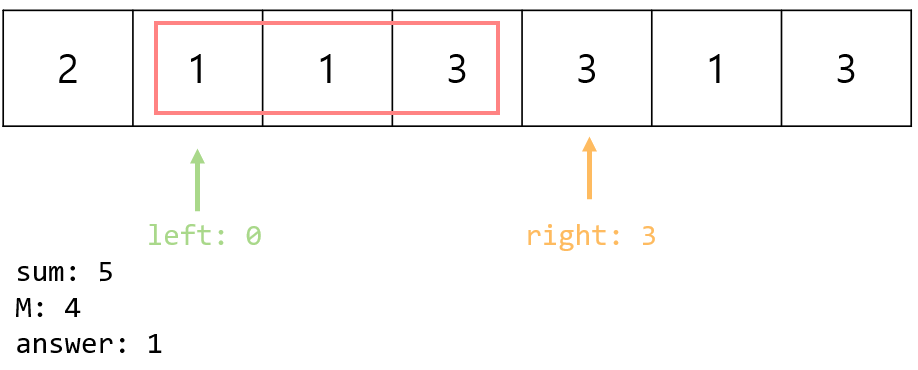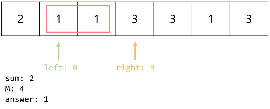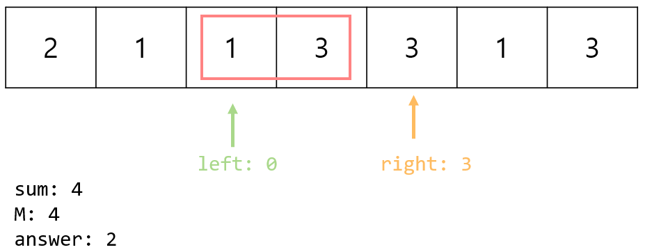 sum이 1 증가해서 3이 되었지만 아직 M보다 작기 때문에 한번 더 right가 가리키는 값을 sum에 더한 후 한 칸 더 옮깁니다.