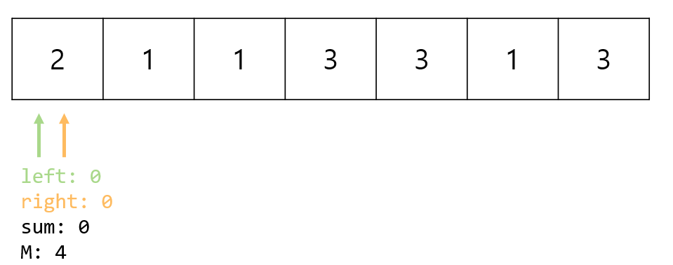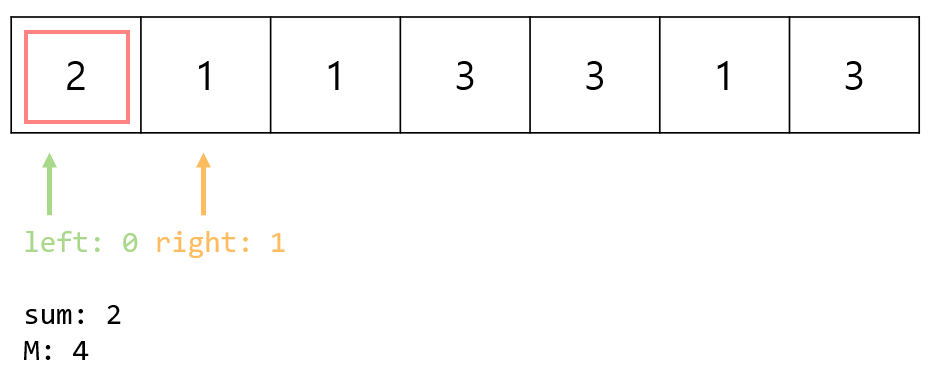 처음 left 포인터와 right 포인터는 0번째 인덱스를 가리킵니다. sum의 값이 M보다 작기 때문에 right가 가리키는 값을 sum에 더한 후 right를 오른쪽으로 옮깁니다.