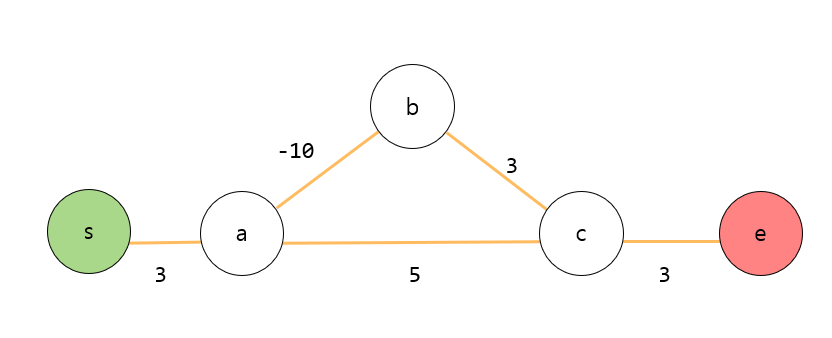 출발지점 s 노드 에서 e로 가기 위한 최단거리를 구하고자 합니다. 만약 b를 거치지 않고 s->a->c 까지 이동한다면 비용이 8이 필요합니다. 하지만 b를 지나서 s->a->b->c로 이동하게 되면 비용이 -4가 됩니다. 그런데 여기서 멈추지 않고 다시 a->b->c로 한 번 더 회전을 한다면 비용을 더 줄일 수 있습니다. s->a->b->c->a->b->c 이렇게 이동할 경우 비용은 -6이 됩니다. 사이클을 한번 더 돌아서 s->a->b->c->a->b->c->a->b->c 가 될 경우 비용은 -8이 됩니다. 즉, 사이클은 무한히 돌 수 있으며 돌 때마다 비용은 계속 작아지게 됩니다. 그래서 음의 사이클이 존재할 경우 최소 비용을 구할 수 없게 됩니다.