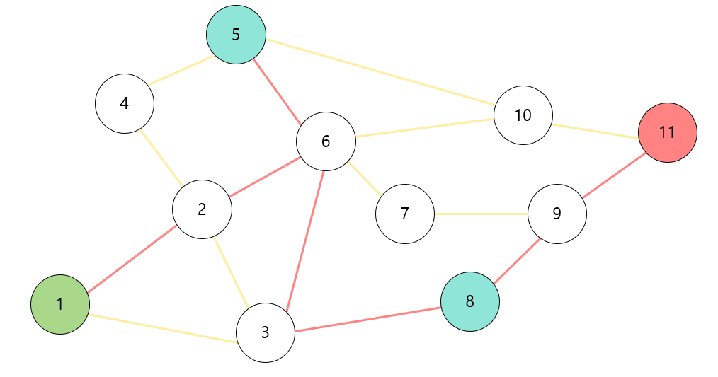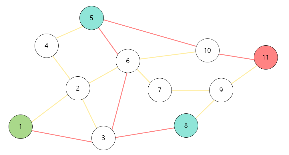 이 문제는 양의 가중치를 간선을 가진 그래프에서 최단 경로를 찾는 문제의 변형이다. 출발 노드 1에서 도착 노드 N까지 가는 도중 v1과 v2 노드를 반드시 지나야 한다. 그리고 아래의 그림처럼 1 → v1 → v2 → N으로 가는 경로와 1 → v2 → v1 → N 으로 가는 경로 두 가지가 존재하고 이 둘 중 더 가까운 경로의 거리를 출력해야 한다.