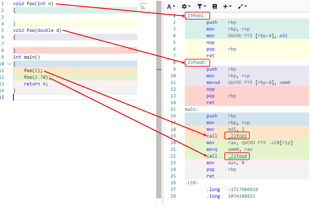 컴파일러가 foo(int n) 함수를 _Z3fooi로 foo(double d) 함수는 _Z3food 함수로 만들어 이름이 서로 다른 함수로 변환한 것을 확인할 수 있다.