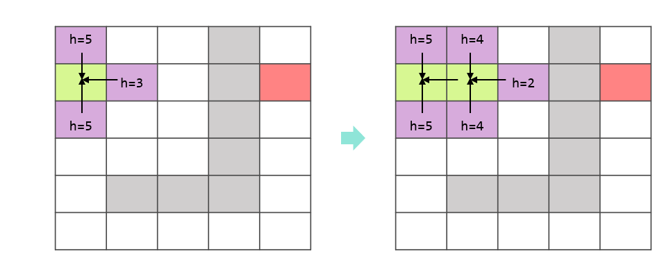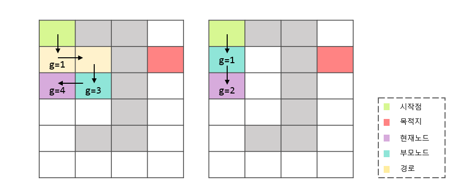 그래서 노드x에 부모를 할당하기 전에 \(A^*\)는 g(x) 값이 더 개선될 수 있을지를 확인해야 한다.