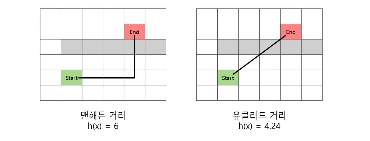 휴리스틱 함수는 맨해튼 거리 방식과 유클리드 거리 방식으로 나뉜다.