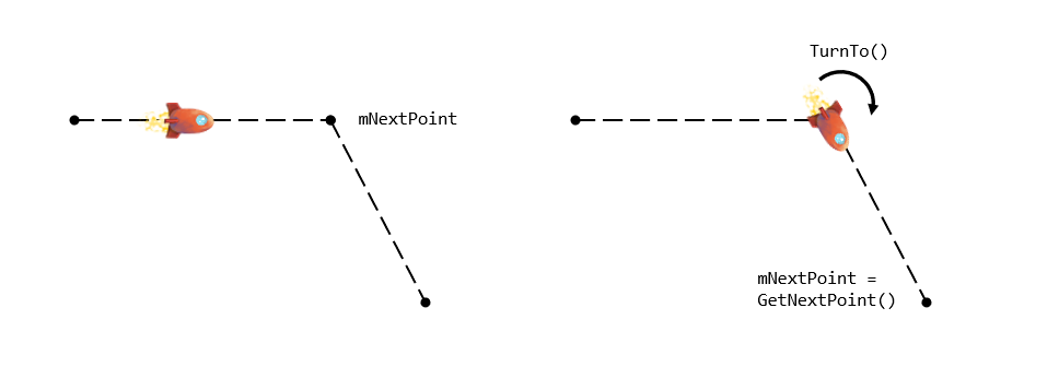 mNextPoint에 도달할때 까지 앞 방향으로 이동한다. mNextPoint에 도달했다면 새로운GetNextPoint()함수로 다음mNextPoint를 받아오고 새로운mNextPoint방향을 향해서 회전한다.