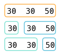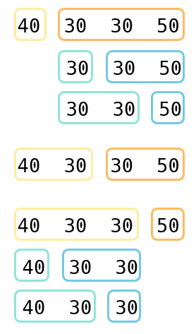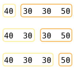 우선 큰 문제를 작은 문제로 나눠 봅시다. 문제의 첫 번째 예시 (40 30 30 50) 인경우를 살펴보겠습니다. 장의 수가 총 4개일 때 마지막으로 파일을 합쳐서 하나로 만들 때는 다음과 같이 3가지의 경우가 존재할 것입니다.
