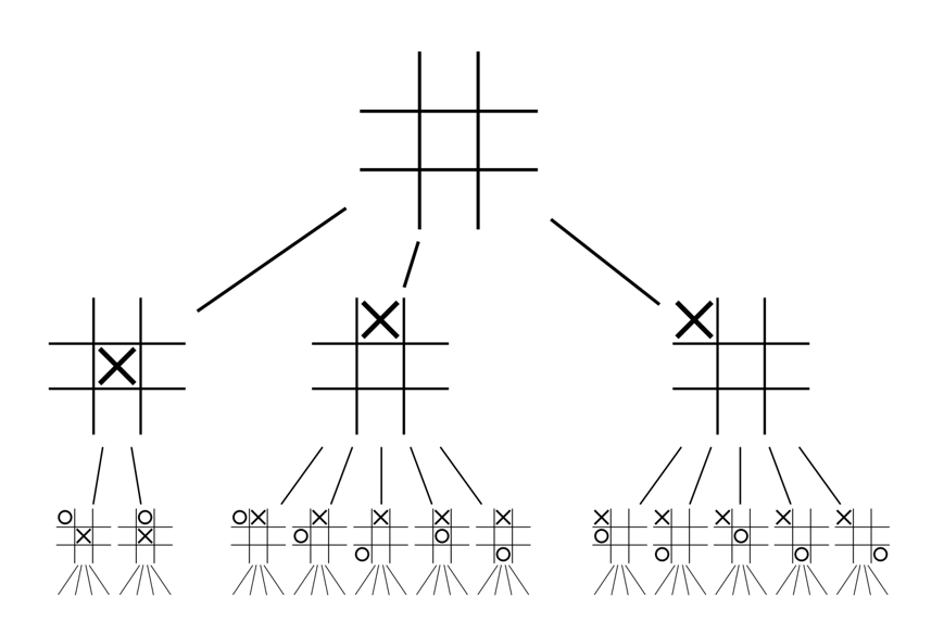 여러 게임들은 다양한 상태를 가질 수 있고 틱택토같 이 모든 상태를 노드로 갖는 게임 트리를 완전한 게임 트리라고 한다. 틱택토는 3 x 3 맵에서 진행되는 단순한 게임으로 발생 가능한 모든 경우의 수는 9!, 즉 362,880개의 경우의 수가 존재한다. 틱택토를 완전한 게임 트리로 다루기 위해서는 362,880개의 노드가 필요하다. 하지만 체스의 경우 완전한 게임 트리는 \(10^{120}!\)의 노드가 필요하므로 시간과 공간의 복잡도를 완전히 평가하는것이 불가능 하다.