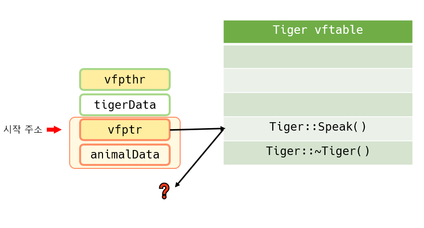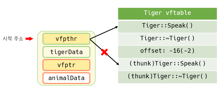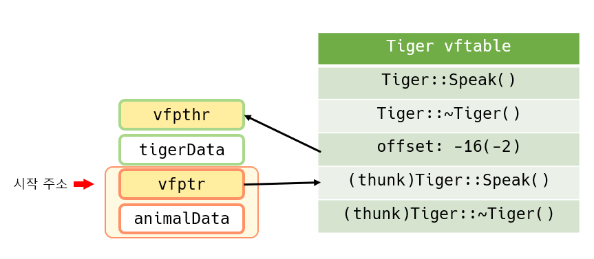 만약 Tiger 포인터에서 Animal 포인터 처럼 offset값을 참조하여 멤버변수를 찾게된다면 엉뚱한 값을 찾게된다. 때문에 Tiger 포인터에서는 일반 Tiger::Speak 함수를 호출할 수 있도록 하기 위해서 Virtual table에는 thunk 함수와 일반 멤버 함수를 모두 갖고 있게된 것이다.