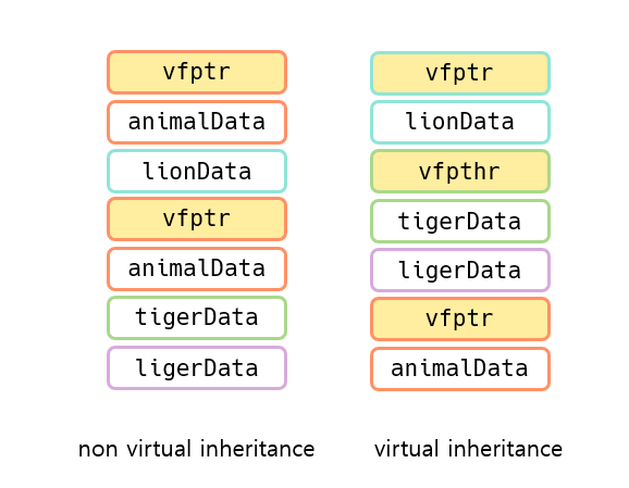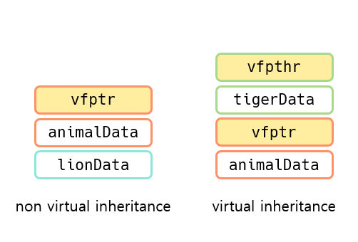 키워드를 붙여줘야 한다. 가상 상속과 비 가상 상속의 차이를 살펴보자. 가상 상속을 받지 않은 Lion의 크기는 24바이트인 반면에 가상 상속을 받은 Tiger의 크기는 32바이트가 된다. 가상 상속을 받을 경우 아래의 그림처럼 가상 함수 포인터가 하나 더 생기기 때문에 사이즈가 더 커지게 된 것이다.