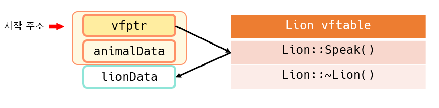 Animal 포인터는 Animal 클래스의 데이터만 볼 수 있지만, Lion의 Speak 함수에 접근하게 되면 시작 위치에서 부터 2칸 아래에 lionData