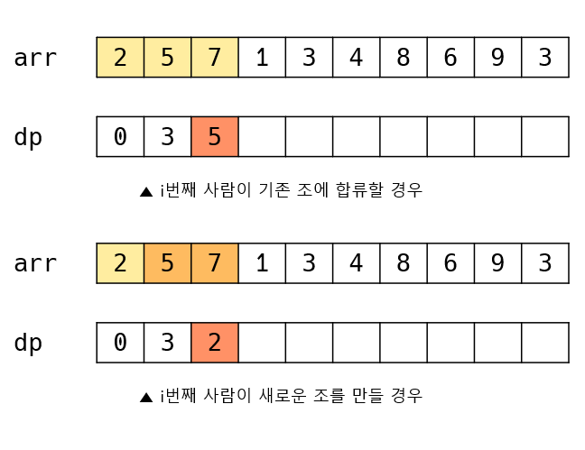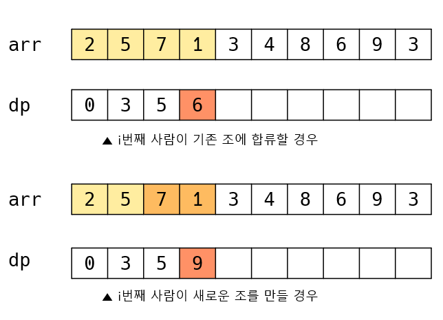 이 있습니다. 여기에서는 조를 새로 꾸리는 방법이 더 효율적이기 때문에dp[3]은 9가 됩니다.