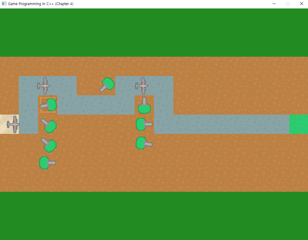 4장에 제공된 소스코드에 위의 이미지처럼 기본적인 타워디펜스가 구현되어 있다. 실행해보면 사실 마땅히 적용할 만한 상태 기계가 없어 보인다. Enemy는 이동하고 죽는 것이 전부로 보이고 Tower는 탐색, 공격이 상태의 전부이다. 그래서 상태 기계를 더 풍부하게 구현하기 위해서 Tower에 조준(Lock on)이라는 한 가지 기능을 임의로 더 추가해 보았다.