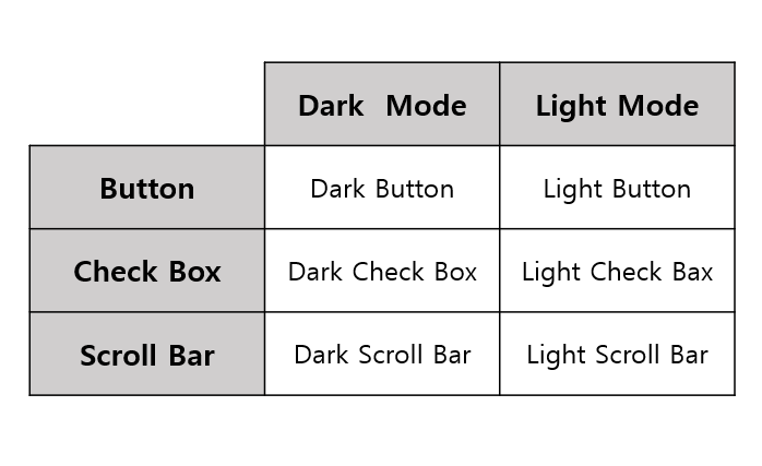 추상화 팩토리 패턴은 매트릭스 관계를 가진 오브젝트를 생성할 때 유용하게 활용할 수 있는 패턴입니다. 예를 들어서 UI를 생성하기 위한 팩토리 패턴을 상상해봅시다. UI에는 Button, Check Box, Scroll Bar 등이 있습니다. 그리고 UI의 테마로 Dark Mode, Light Mode가 있을 수 있습니다.