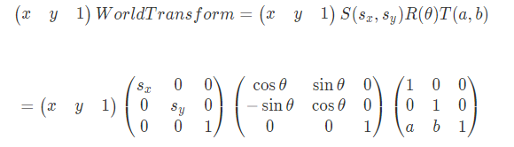 \[WorldTransform = S(s_x,s_y)R(\theta)T(a,b)\]