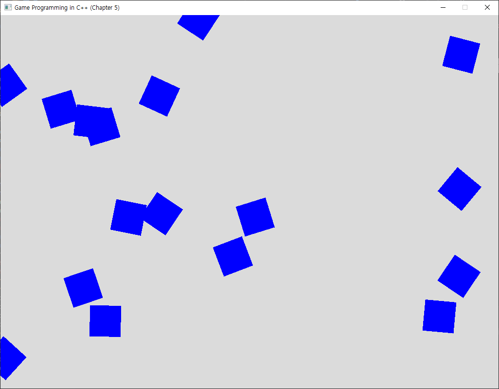 현재는 전부 파랑색 사각형으로 보이지만 이들은 아직 텍스쳐를 입히기 전인 우주선과 운석의 sprite 들이다. 3장에서 사용했던 조작방식 그대로 잘 움직이고 레이져도 발사하는 것을 확인할 수 있을 것이다. 변환에 대한 설명은 여기서 마치고 다음 글에서는 텍스처에 대해서 다루도록 한다.