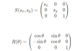 동차 좌표계를 사용하면서 얻는 가장 큰 장점은 모든 변환을 행렬의 곱으로 합성하여 하나의 변환행렬로 표현할 수 있다는 점이다. 우선 모든 변환 행렬을 곱하기 위해서는 스케일과 회전 변환도 \(3\times3\) 행렬로 만들어줄 필요가 있다.
