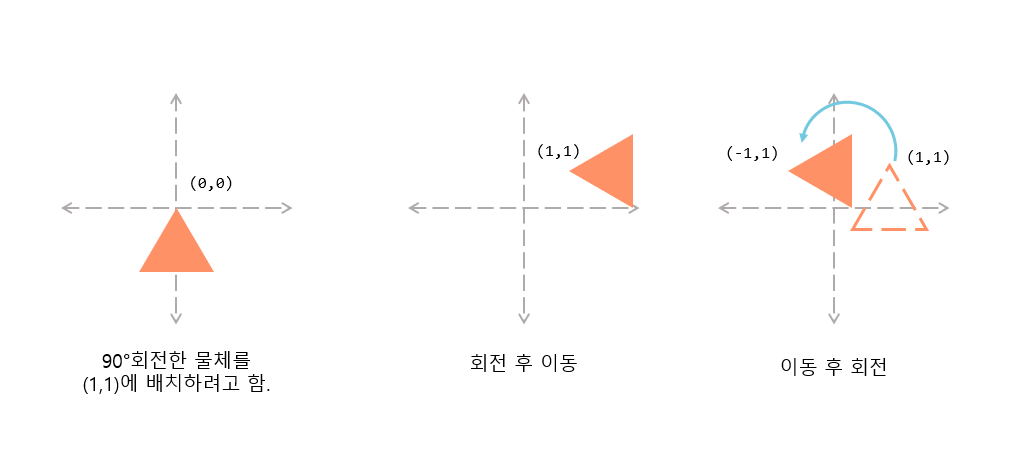 이때 유의할 점은 행렬에서 교환법칙은 성립하지 않는다는 점이다. 즉 회전 후 이동하는 것과 이동후 회전하는 것의 결과는 동일하지 않다. (회전을 할 때는 오브젝트 좌표를 중점으로 회전하는 것이 아니라 세계좌표계의 원점을 중심으로 회전한다.) 이를 그림으로 나타내면 다음과 같다. 회전변환을 이동 변환보다 늦게 적용하여서 물체의 위치가 우리가 원하던 위치에서 벗어났다.