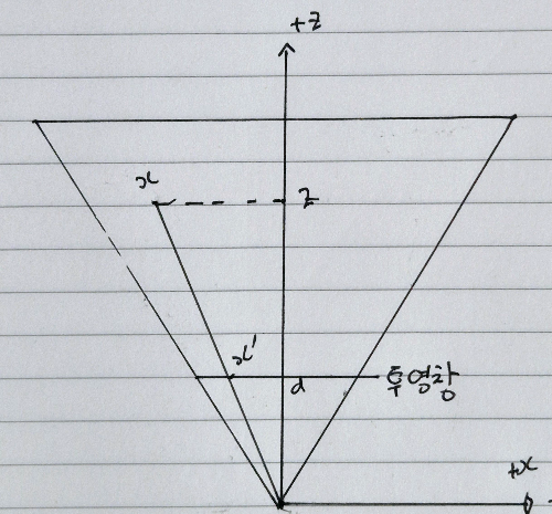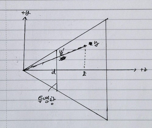 닮은 꼴 삼각형의 원리를 이용하여 투영된 \(x’\) 와 \(y’\) 값을 계산하면 다음과 같다.