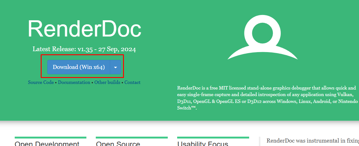 RenderDoc은 아래의 공식 홈페이지에서 다운로드 가능. 다운 후 설치 진행.