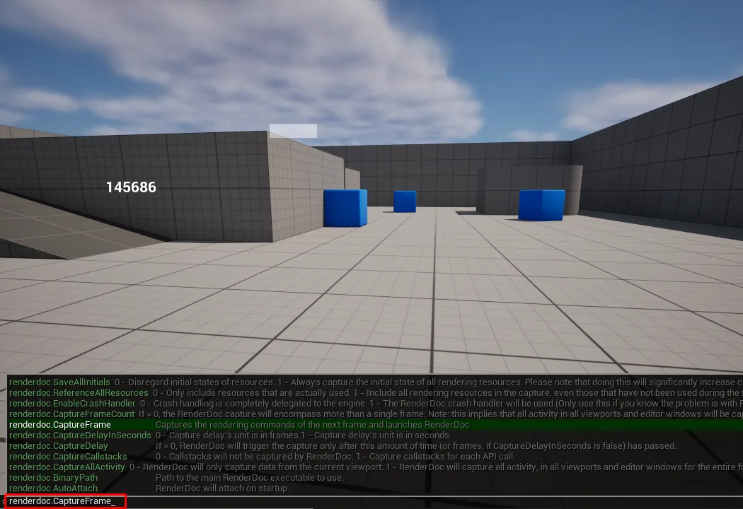 RenderDoc 아이콘 클릭 or Alt + F12 or 콘솔 명령어: RenderDoc.CaptureFrame