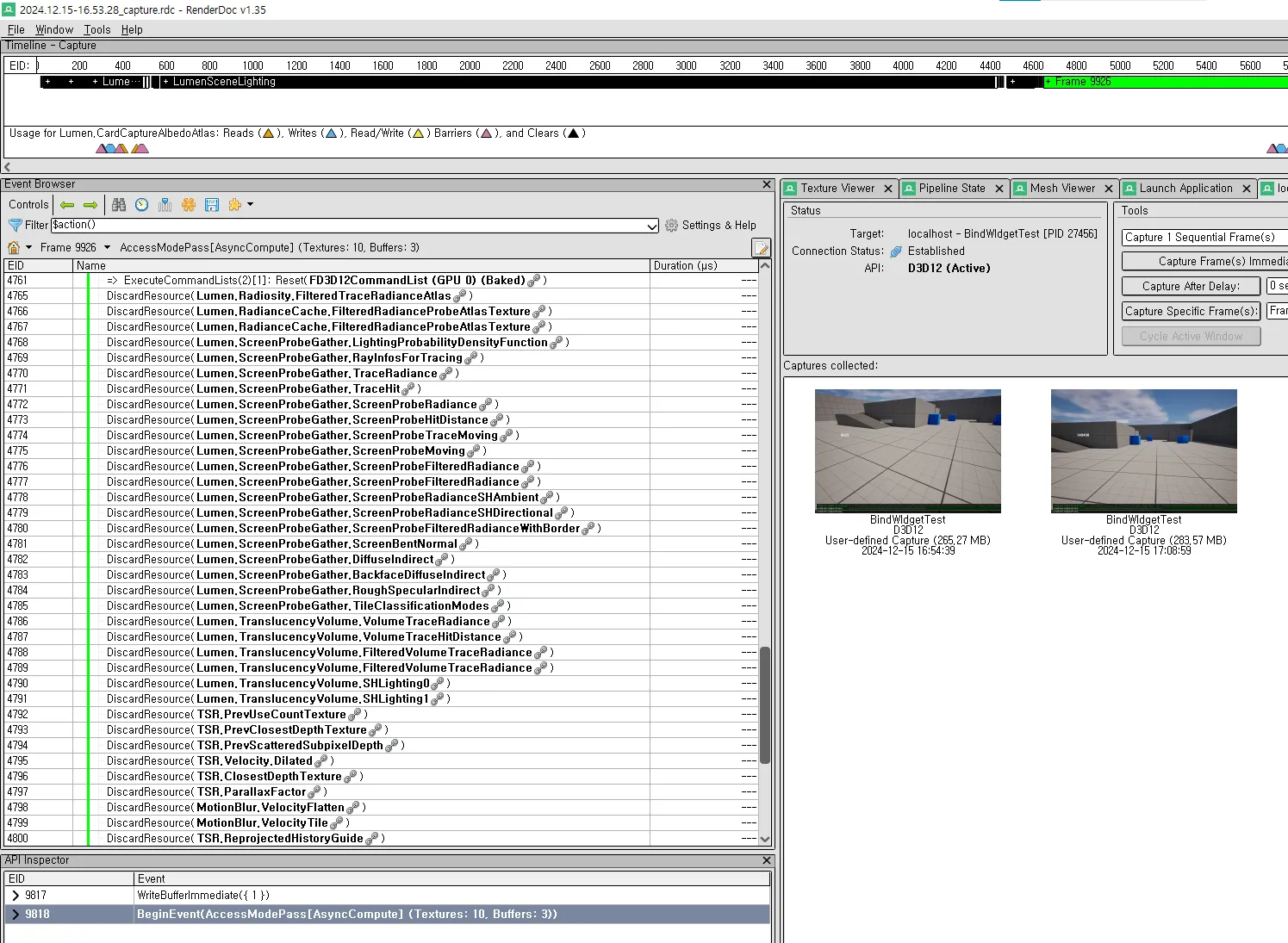 RenderDoc으로 캡처를 로드하면 이벤트, API 등을 통해 GPU 상황을 자세히 조사 가능.
