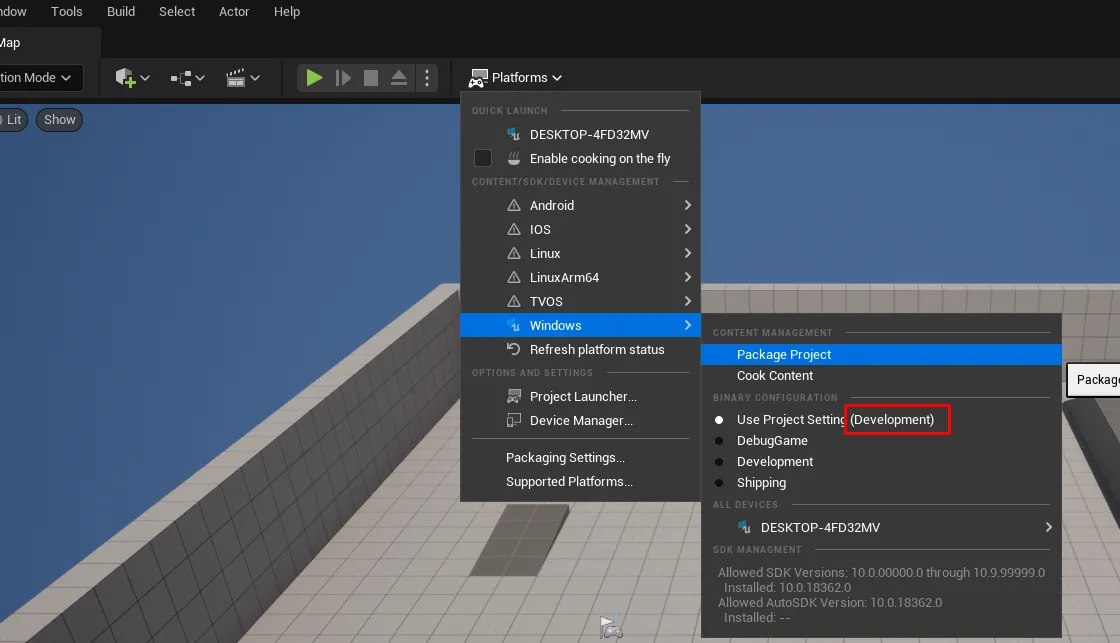 에디터 상단에서 Platforms > Windows > Package Project 선택 후 폴더 지정하면 해당 폴더에 배포버전 exe 실행파일 생성됨.