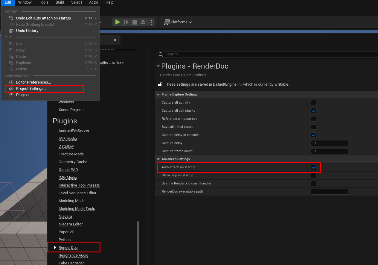 Project Settings > RenderDoc > Auto attach on startup 옵션 활성화 후 에디터 재실행.