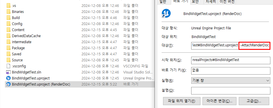 에디터 실행시 가끔씩 RenderDoc을 실행시킬 때 유용. cmd창으로 직접 해도 되지만, 여기서는 UE5 도큐먼트에서 안내된 방식인 바로가기 아이콘을 활용하여 진행함.