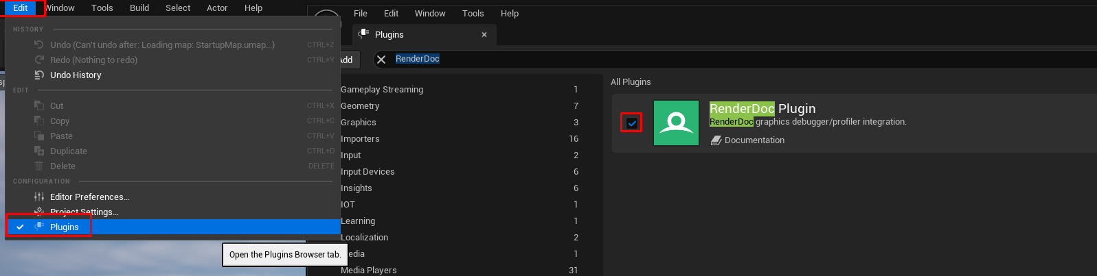 Edit > Plugins에서 RenderDoc 프러그인을 찾은 뒤 활성화
