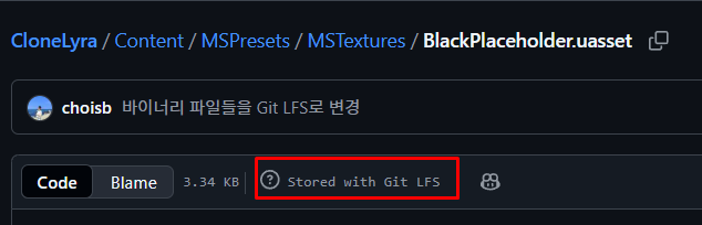 # UE file types *.uasset filter=lfs diff=lfs merge=lfs -text *.umap filter=lfs diff=lfs merge=lfs -text # Raw Content types *.fbx filter=lfs diff=lfs merge=lfs -text *.3ds filter=lfs diff=lfs merge=lfs -text *.psd filter=lfs diff=lfs merge=lfs -text *.png filter=lfs diff=lfs merge=lfs -text *.mp3 filter=lfs diff=lfs merge=lfs -text *.wav filter=lfs diff=lfs merge=lfs -text *.xcf filter=lfs diff=lfs merge=lfs -text *.jpg filter=lfs diff=lfs merge=lfs -text *.uexp filter=lfs diff=lfs merge=lfs -text *.bank filter=lfs diff=lfs merge=lfs -text *.tmp filter=lfs diff=lfs merge=lfs -text *.vox filter=lfs diff=lfs merge=lfs -text # Libraries and executables *.a filter=lfs diff=lfs merge=lfs -text *.lib filter=lfs diff=lfs merge=lfs -text *.exe filter=lfs diff=lfs merge=lfs -text *.zip filter=lfs diff=lfs merge=lfs -text - 변경 사항 커밋. 정상 적용된 경우 github에서 아래와 같이 Git LFS로 저장됨을 확인 가능