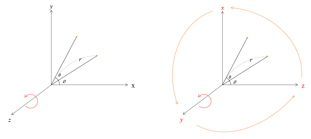 다음으로는 \(x\)축과 \(y\)축을 기준으로 회전변환 식을 유도해보겠다. \(y\)축을 기준으로 회전 변환을 한다는 것인 결국 \(z\)축을 기준으 회전변환을 하는 식에 \(y\)은 \(x\)값으로 \(x\)값은 \(z\)값으로 \(z\)값은 \(y\)값으로 전환하는 것과 동일하다.