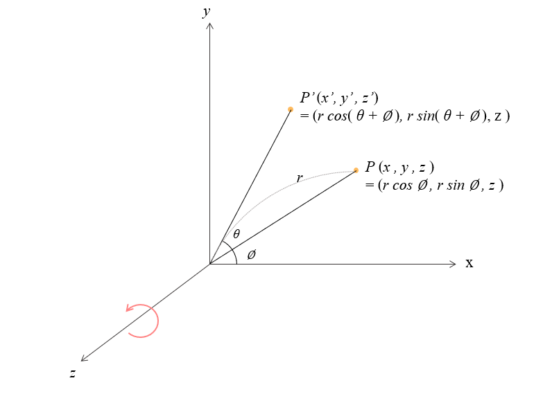 따라서 z축을 중심으로 회전변환을 2차원 \(xz\)평면상 회전변환에 \(z\)축 성분을 유지형태로 다음과 같이 이루어 진다는 것을 알 수 있다. 이를 수식으로 표현하면 다음과 같다.