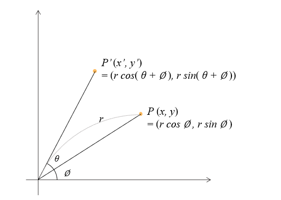 점 \(P\)를 \(\theta\)만큼 회전한 점 \(P'\)의 \(x'\)좌표와 \(y'\)좌표를 \(r\)과 \(\phi\), \(\theta\)로 표현하면 다음과 같다.