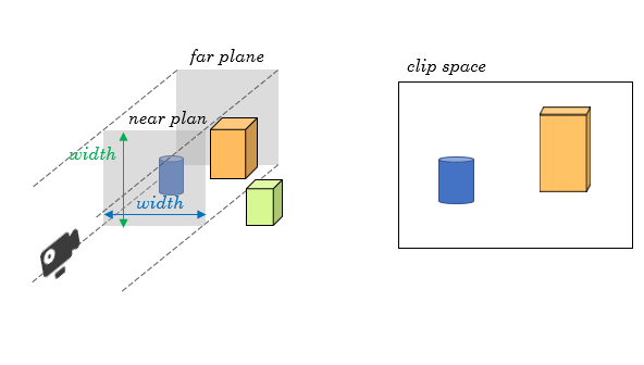 직교 투영에는 가까운 평면과 먼 평면과 평면의 높이 너비가 있다. 이 4개의 값으로 아래의 그림처럼 view volum을 형성하고, 이 공간 밖의 물체는 클립한다(잘라낸다).