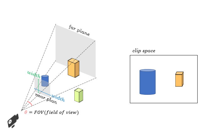 공간좌표는 평면좌표와 다르게 z요소도 가진다. z같은 경우 0이면 가까운 평면의 점을 의미하고 1이면 먼 평면의 점을 의미한다.