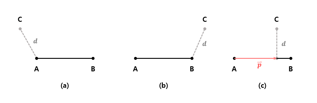 - (a): 선분(벡터) AB와 벡터 AC의 각이 90도 이상일 경우 벡터 AC의 길이가 점과 선분의 최단거리이다.