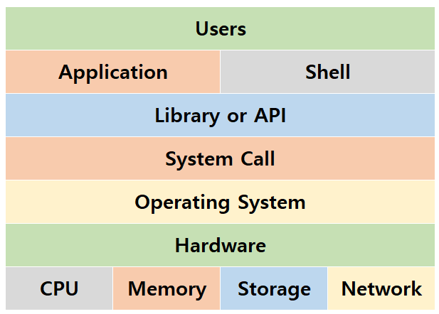 - API(Application Programming Interface): 응용프로그램(쉘도 응용프로그램의 일종)이 운영체제 기능과 서비스를 조작할 수 있도록 운영체제가 제공하는 인터페이스 함수들의 모음. 각 언어별 API가 존재한다.