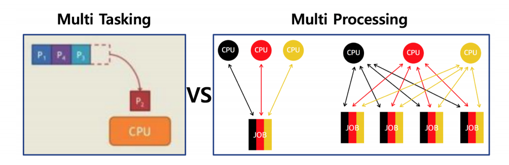 아래는 멀티 태스킹과 멀티 프로세싱의 차이이다. 멀티 태스킹은 여러 프로세스를 동시에 실행하는 방식이고, 멀티 프로세싱은 병렬 처리를 통한 성능 향상이기 때문에 차이를 이해하고 있자.