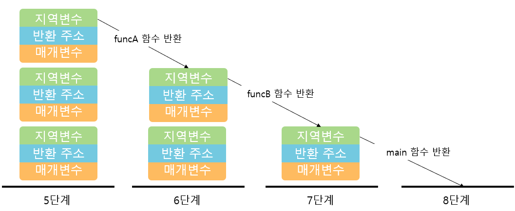 함수의 실행이 끝나면 funcA() 함수의 stack frame부터 순차적으로 반환되며 call stack에서 해제된다.