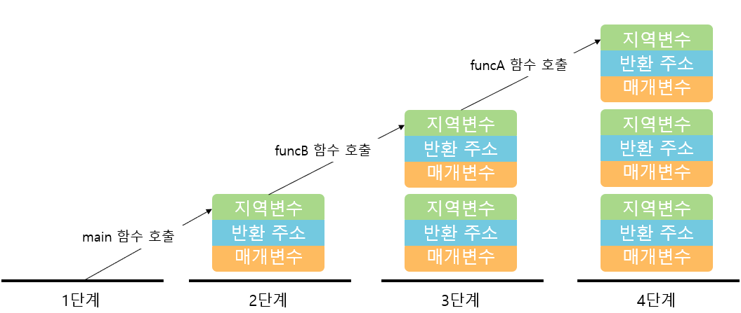 먼저 main() 함수가 실행되면 main함수의 stack frame이 메모리에 로드된 후 순차적으로 funcB()의 stack frame이 다음으로는 funcA()의 스택 프레임이 call stack에 로드된다.