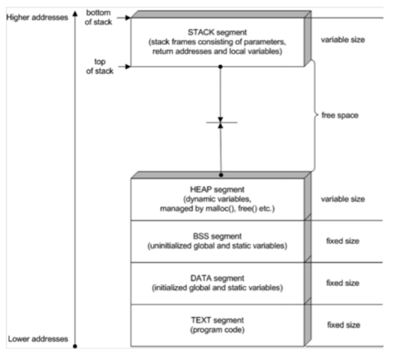 프로그램을 실행한다는 것은 하나 이상의 프로세스가 메모리에 로드됨을 의미한다. 프로세스가 메모리에 로드될 때 다음과 같은 구조를 가지고 로드된다. 이에 대한 자세한 내용은 이 글을 참고하자.