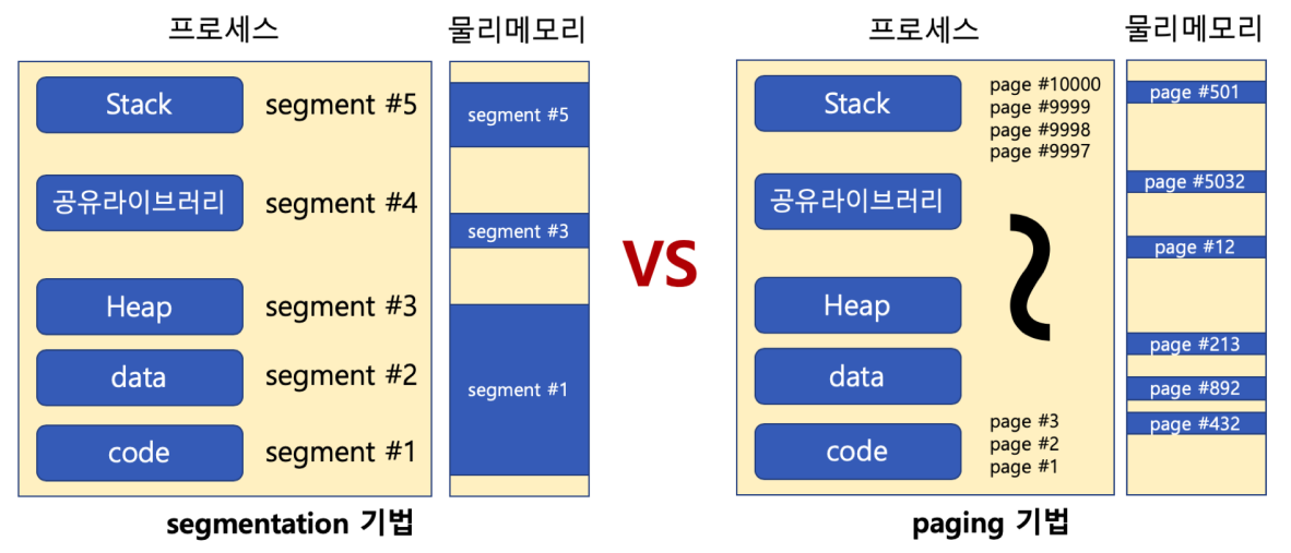 - 세그멘테이션과 페이징 시스템은 모두 하드웨어의 지원이 필요한다. 다양한 컴퓨터 시스템에 이식성을 중요시하는 리눅스는 페이징 기법으로만 구현되어 있다. (일부 CPU가 세그멘테이션을 지원하지 않기 때문)