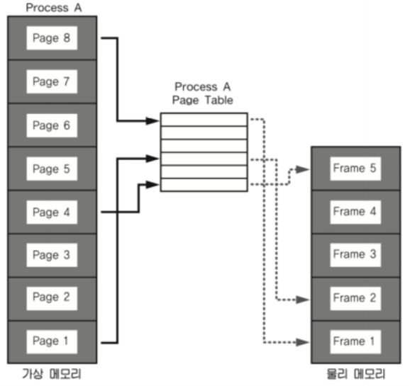 - 요구 페이징: 모든 데이터를 메모리로 적재하지 않고, 실행 중 필요한 시점에서 필요한 페이지만 메모리로 적재(Lazy allocation). 더 이상 필요하지 않은 페이지 프레임은 다시 저장매체에 저장.