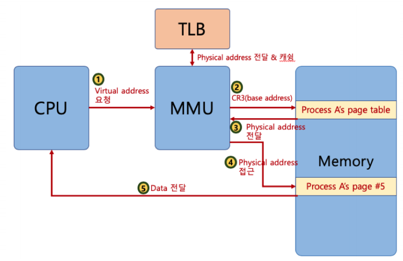 - CPU가 가상 주소로 MMU에 데이터를 요청한다.