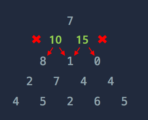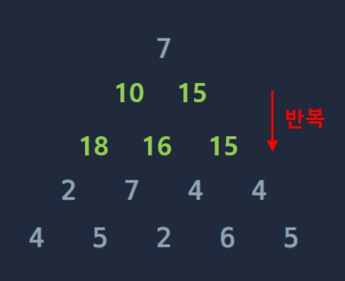 - 삼각형의 가장 좌측 값은 좌측 상단이 없기 때문에 우측 상단값을 가져와서 자신의 값과 합친다.